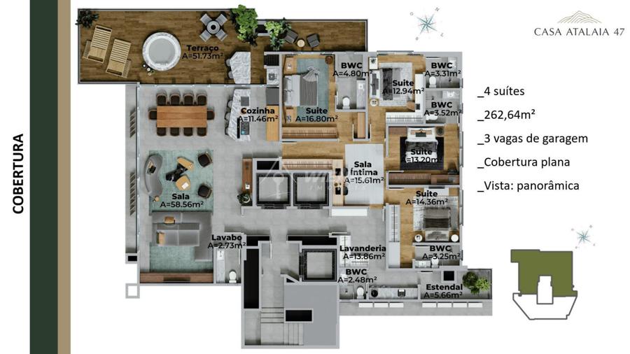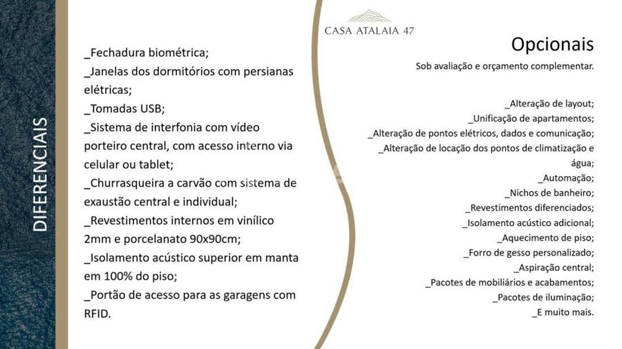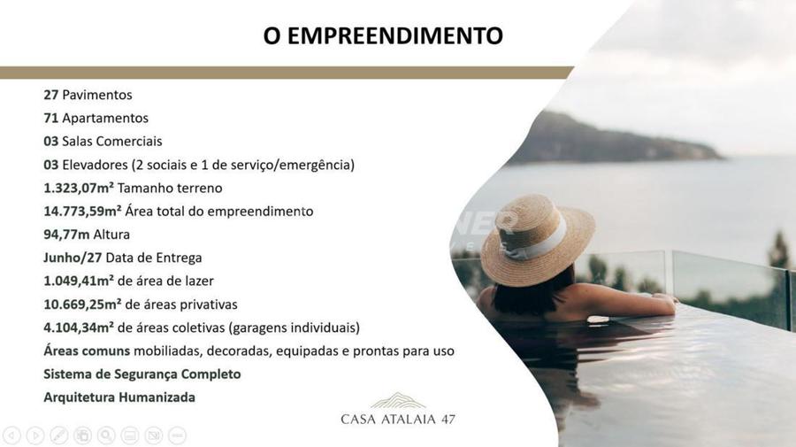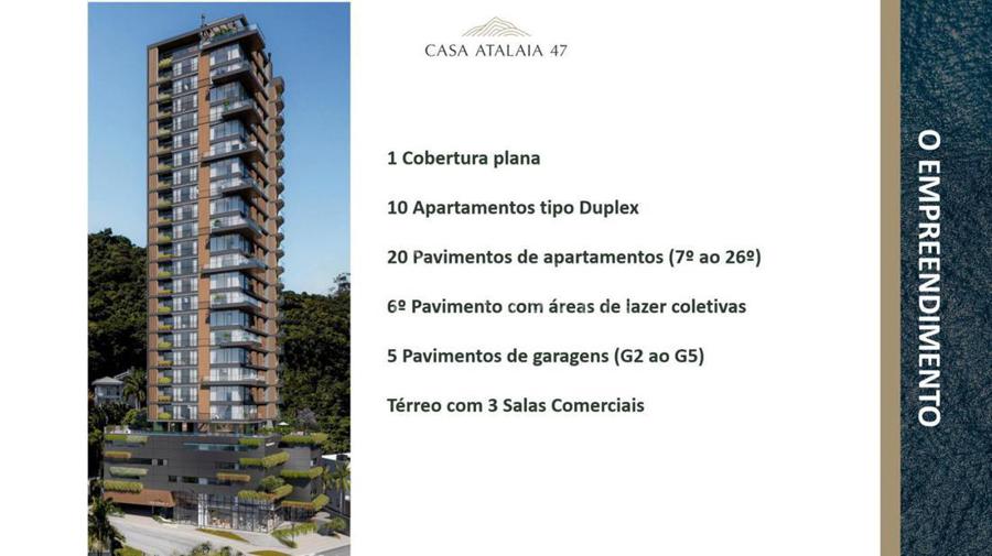 Wiener Imóveis Vende: Empreendimento VISTA TOAL DO MAR, a metros da praia do atalaia, praia de cabeçudas, beira rio, marina, vila gastronômica e ciclovia. excelente localização. Apartamento COBERTURA PLANA, com as 4 laterais livres, 4 suítes, sala de estar, sala de jantar, lavabo, ampla sacada com churrasqueira, 3 vagas de garagem, total infra estrutura de lazer.
